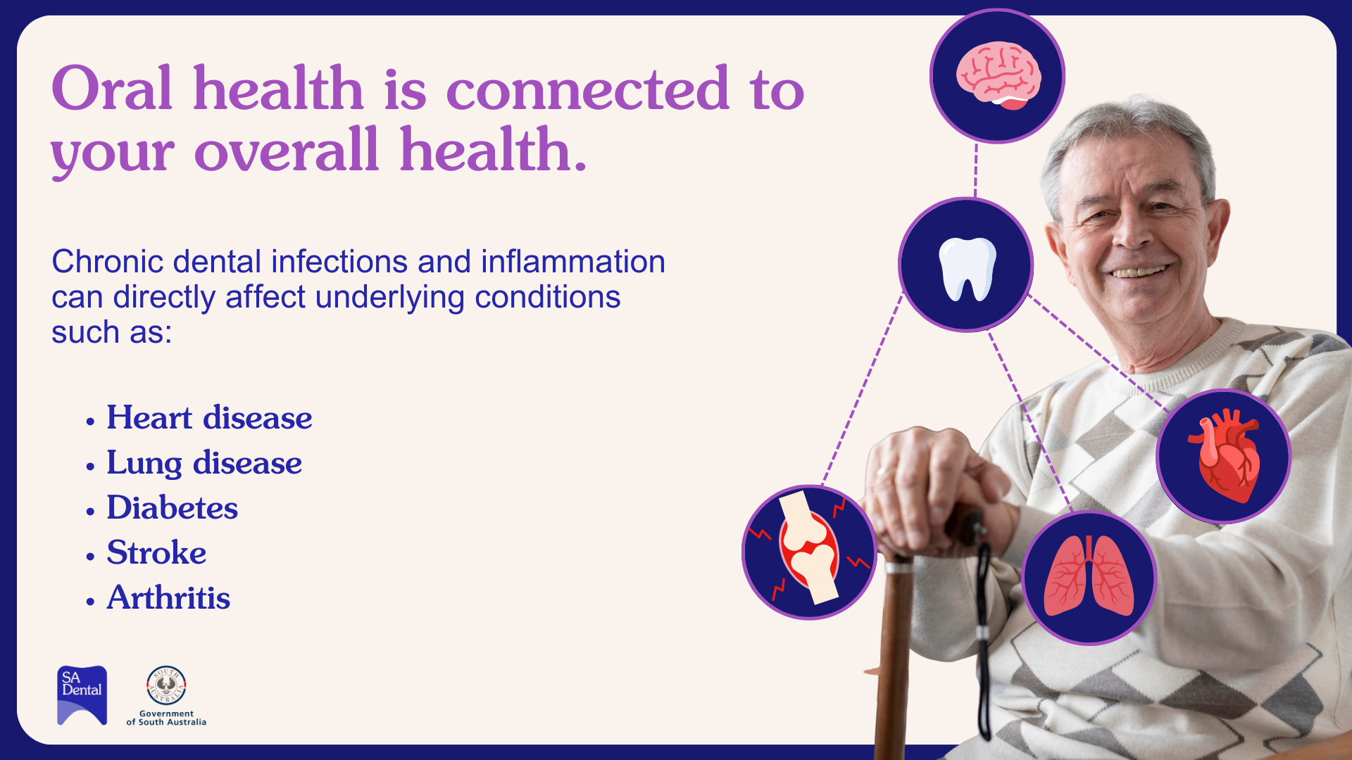 - Oral health is connected to your overall health