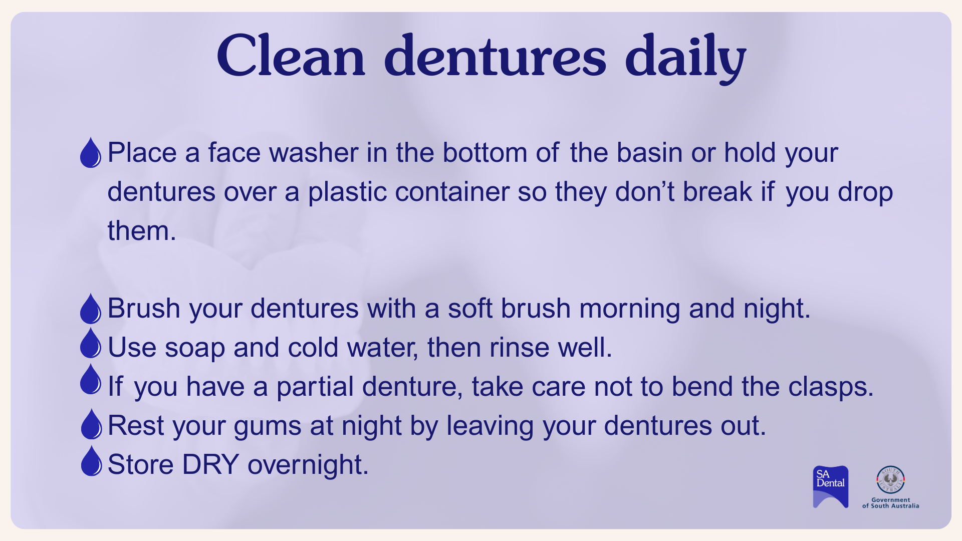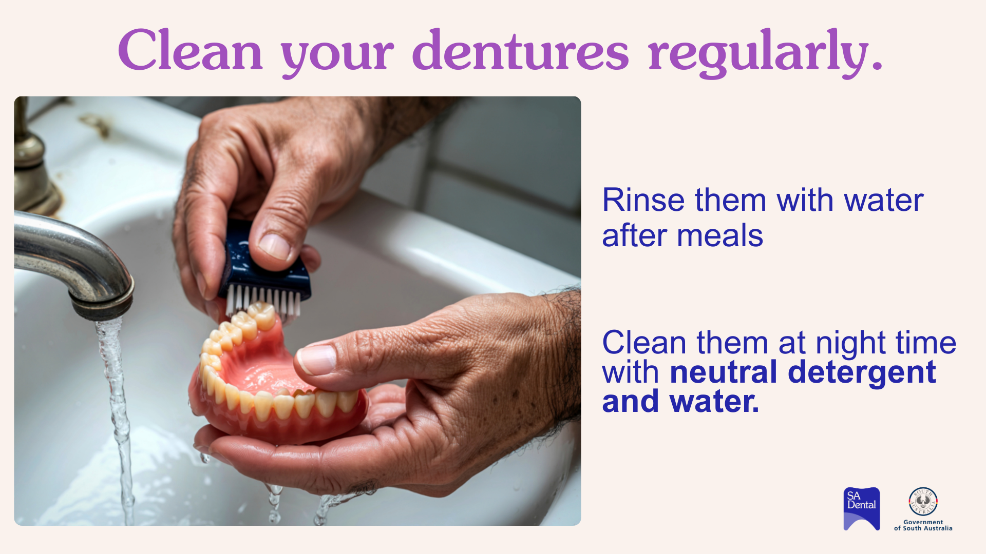 - Clean your dentures regularly